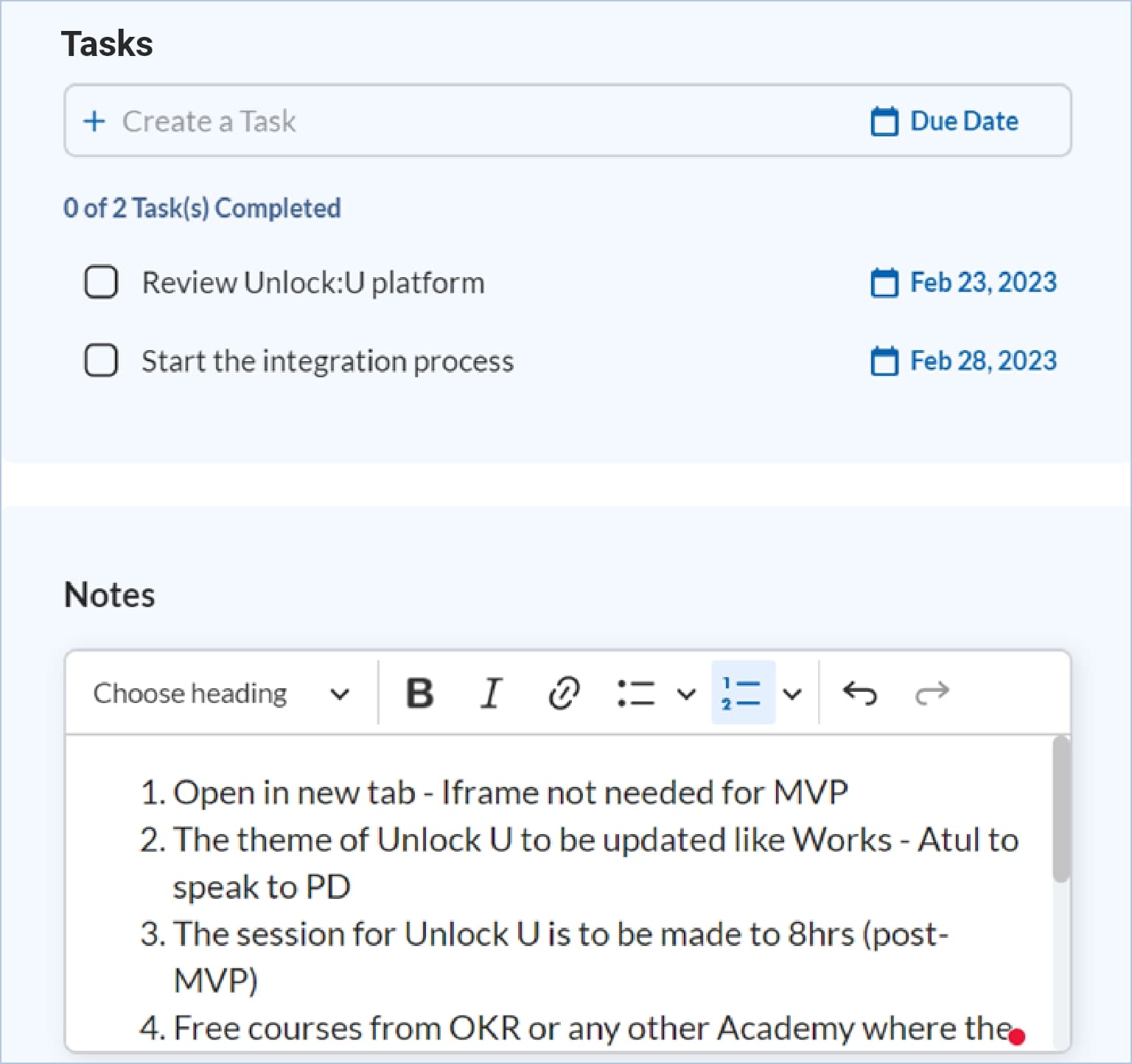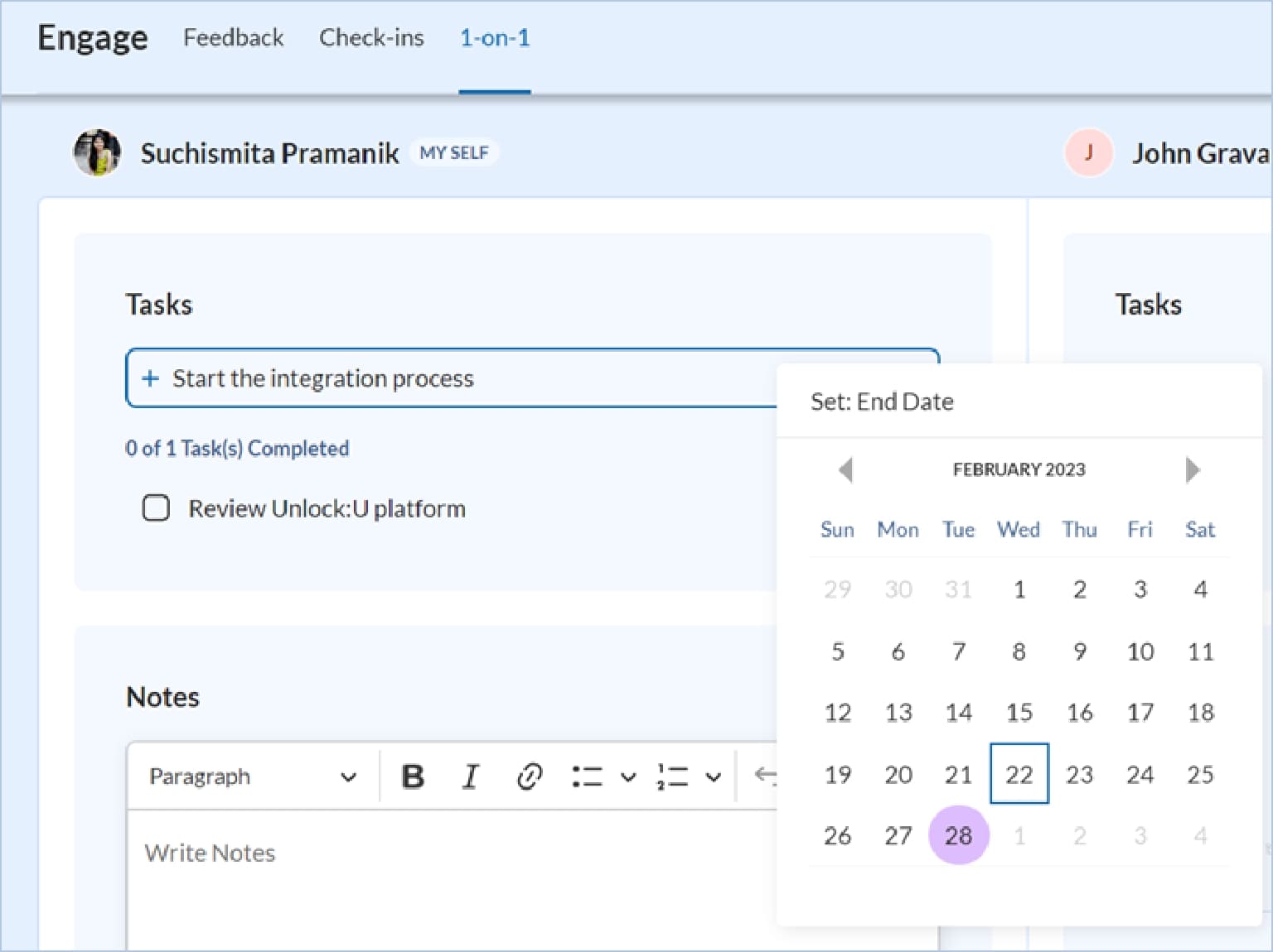 The 1-on-1 meeting section will help you take down meeting notes and plan tasks around the meeting agenda.