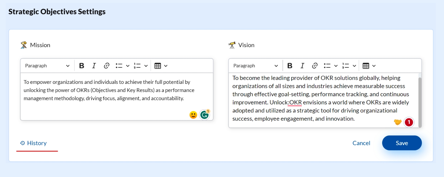 You can add the mission and the vision from Admin Settings. The organization’s admin navigates to Admin Settings, Settings, and Strategic Objective. In Strategic Objectives Settings, the admin can see the option to add the mission and the vision. All the users in the organization can view this mission and vision.