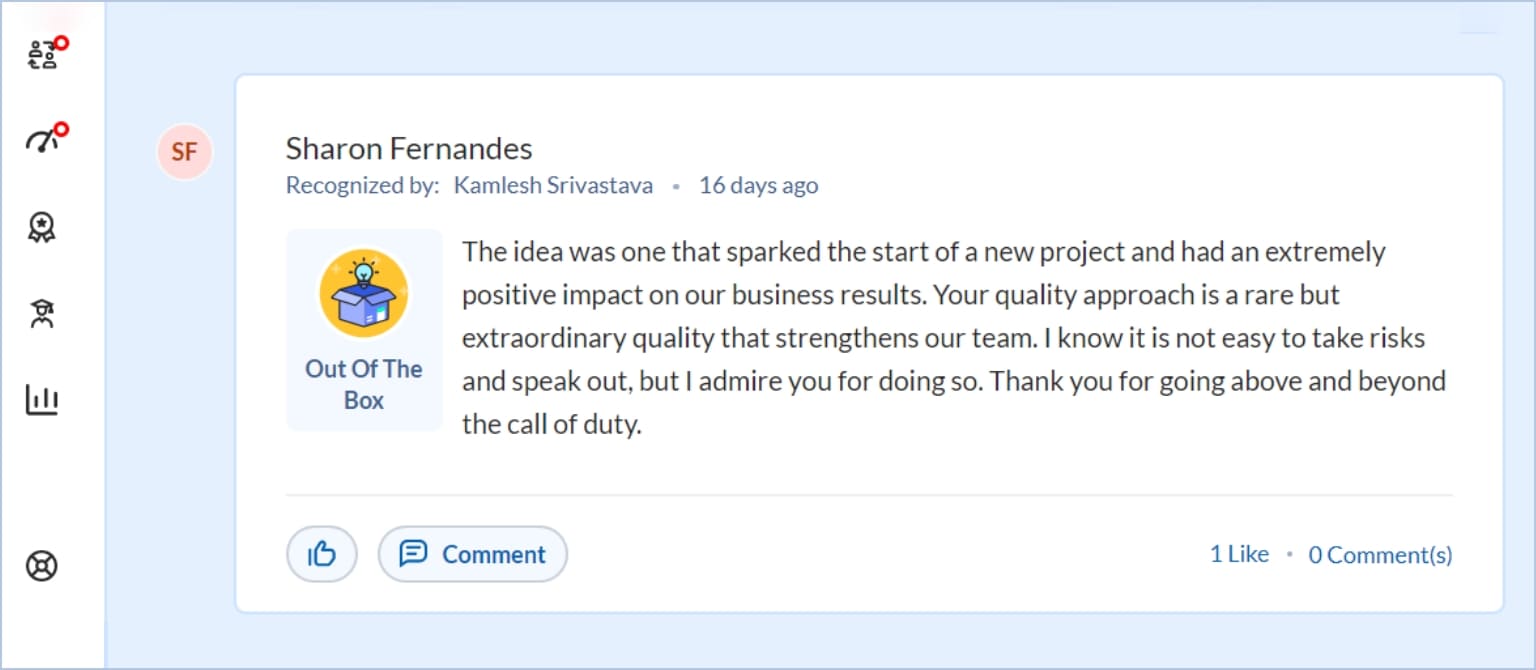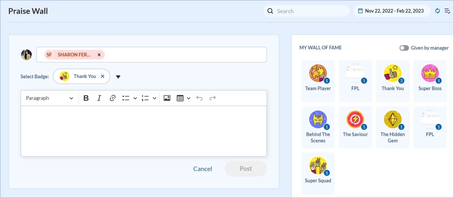 Using the people search bar at the top, search for the user you want to check. You will then be redirected to their wall, where you can give recognition to the user. Check the recognition received by him and given by him.