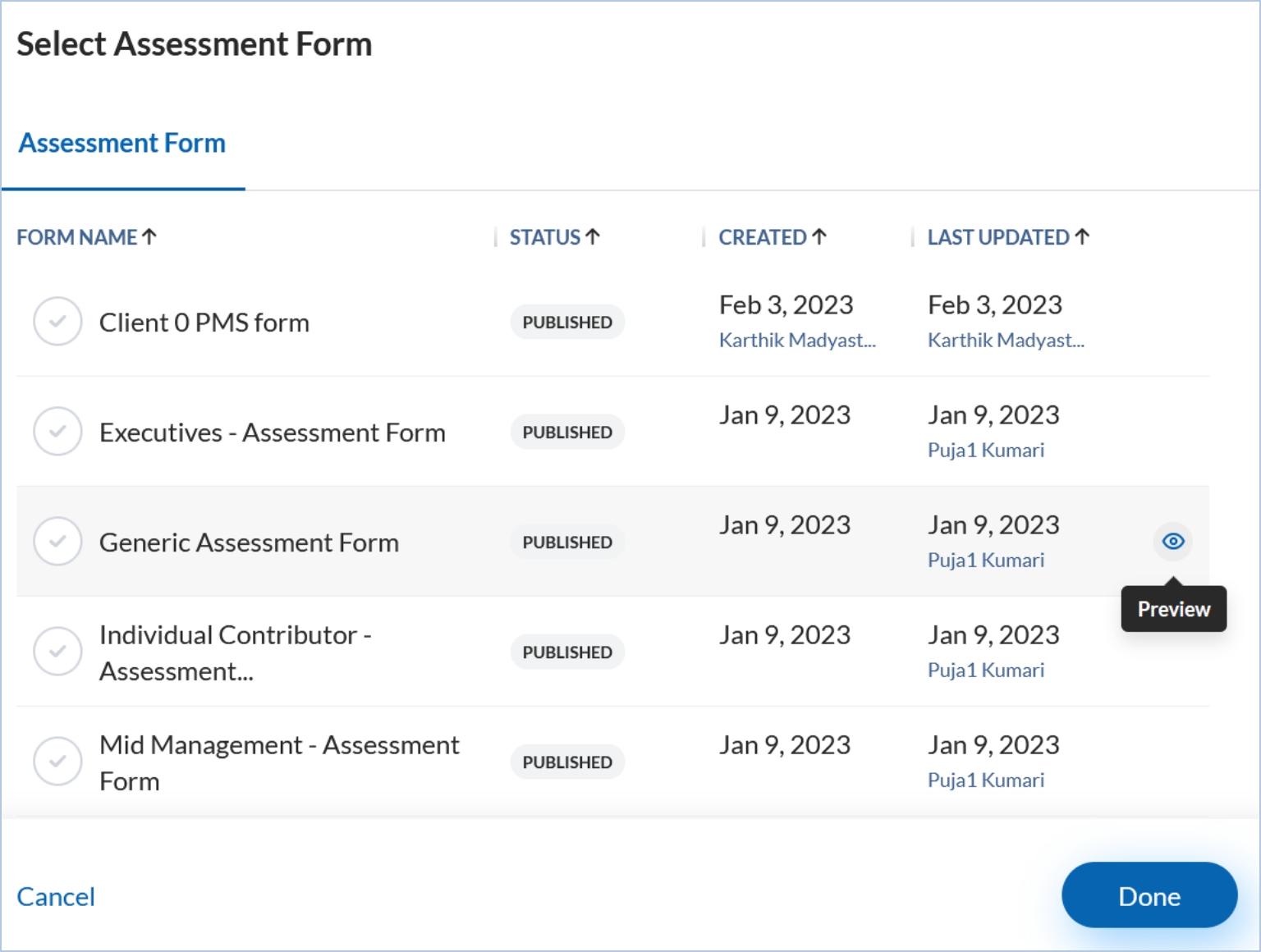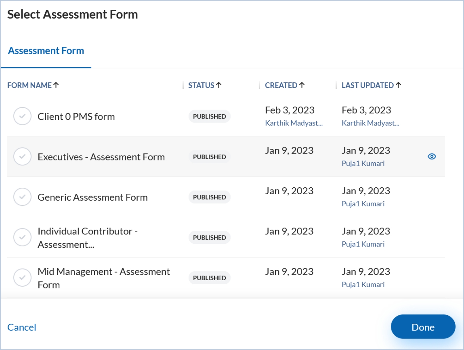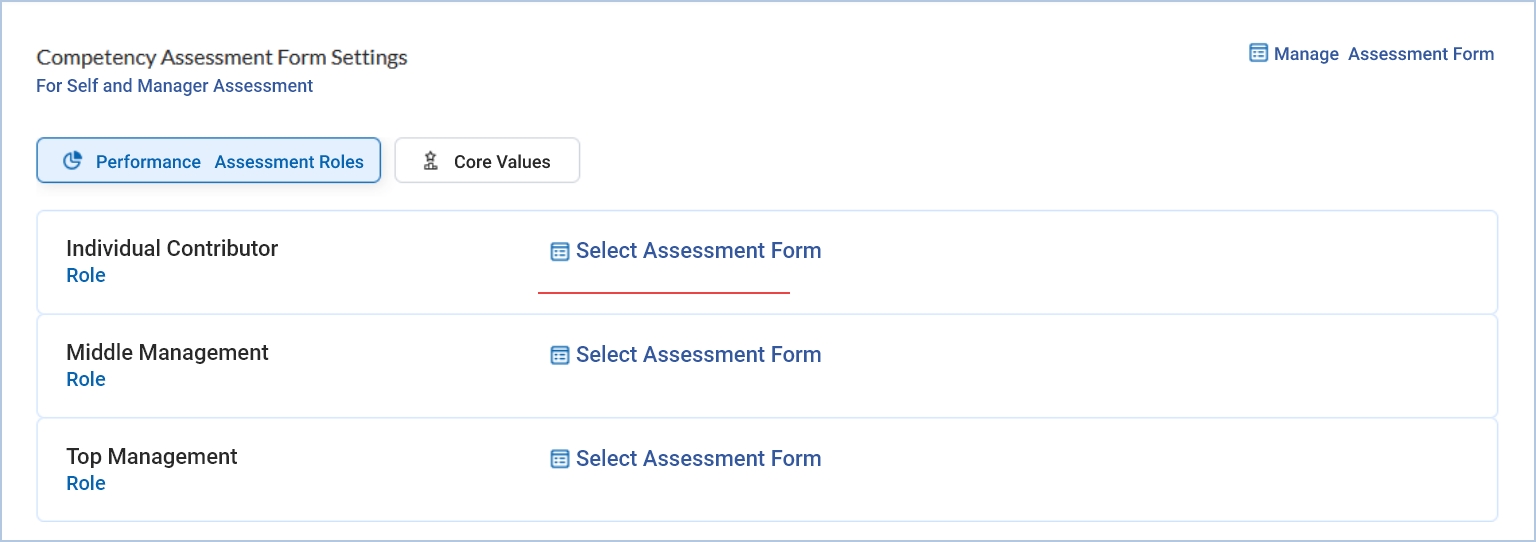 Select a rating form against each employee level in the performance assessment role. To do so, click on “Select Assessment Form”.
