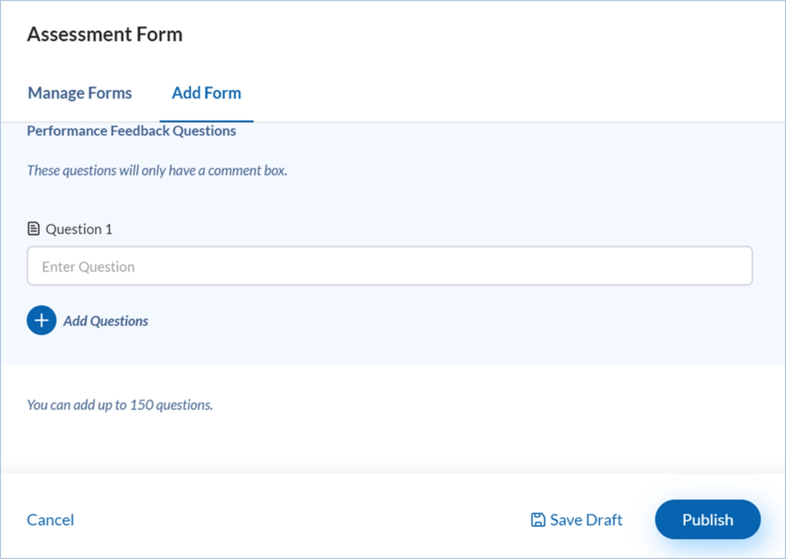 A blank template will appear where you can add the form name, rating, and descriptive questions. You may either save the form as a draft or publish it. Once you publish this form, it will be listed in the “Assessment Forms” list.