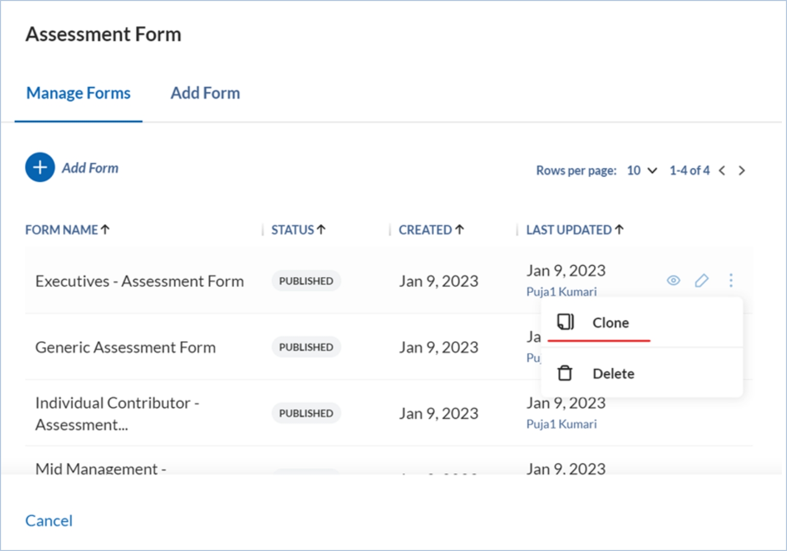 You may also clone a form by clicking the “Clone” icon in the kebab menu.