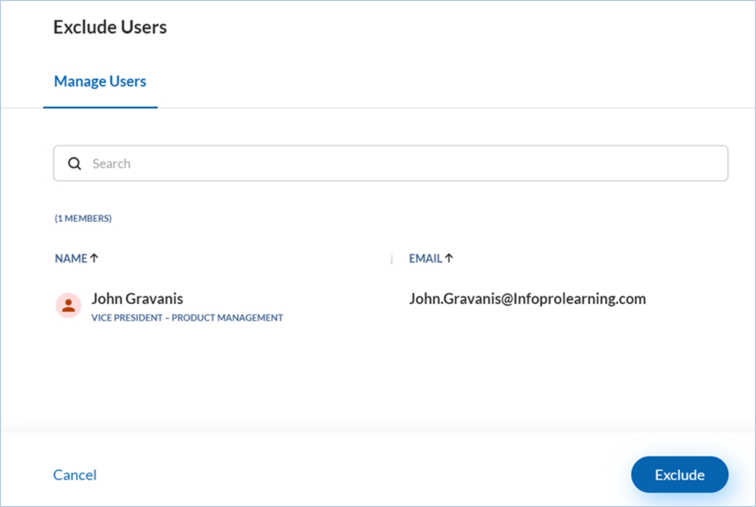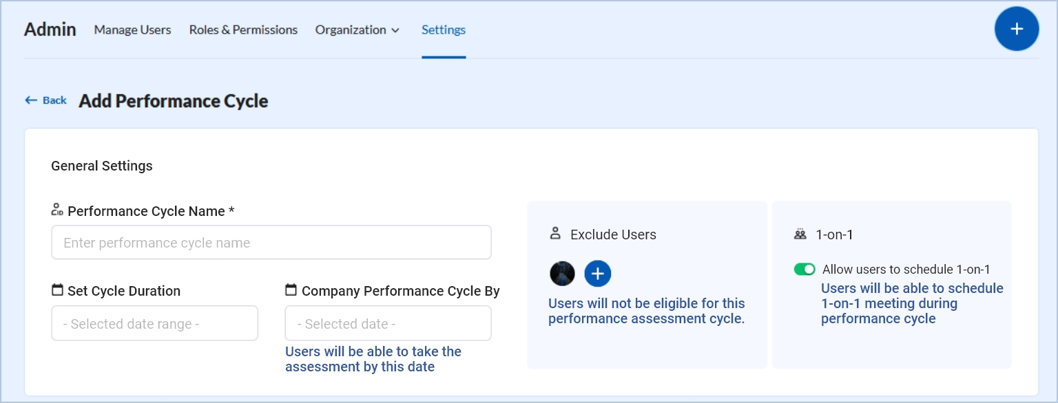 Step 3: Click the “+” icon in the “Exclude Users” box to exclude a few users from the performance review cycle. A right drawer will open. Search for the user/users to be excluded and click on “Exclude.”