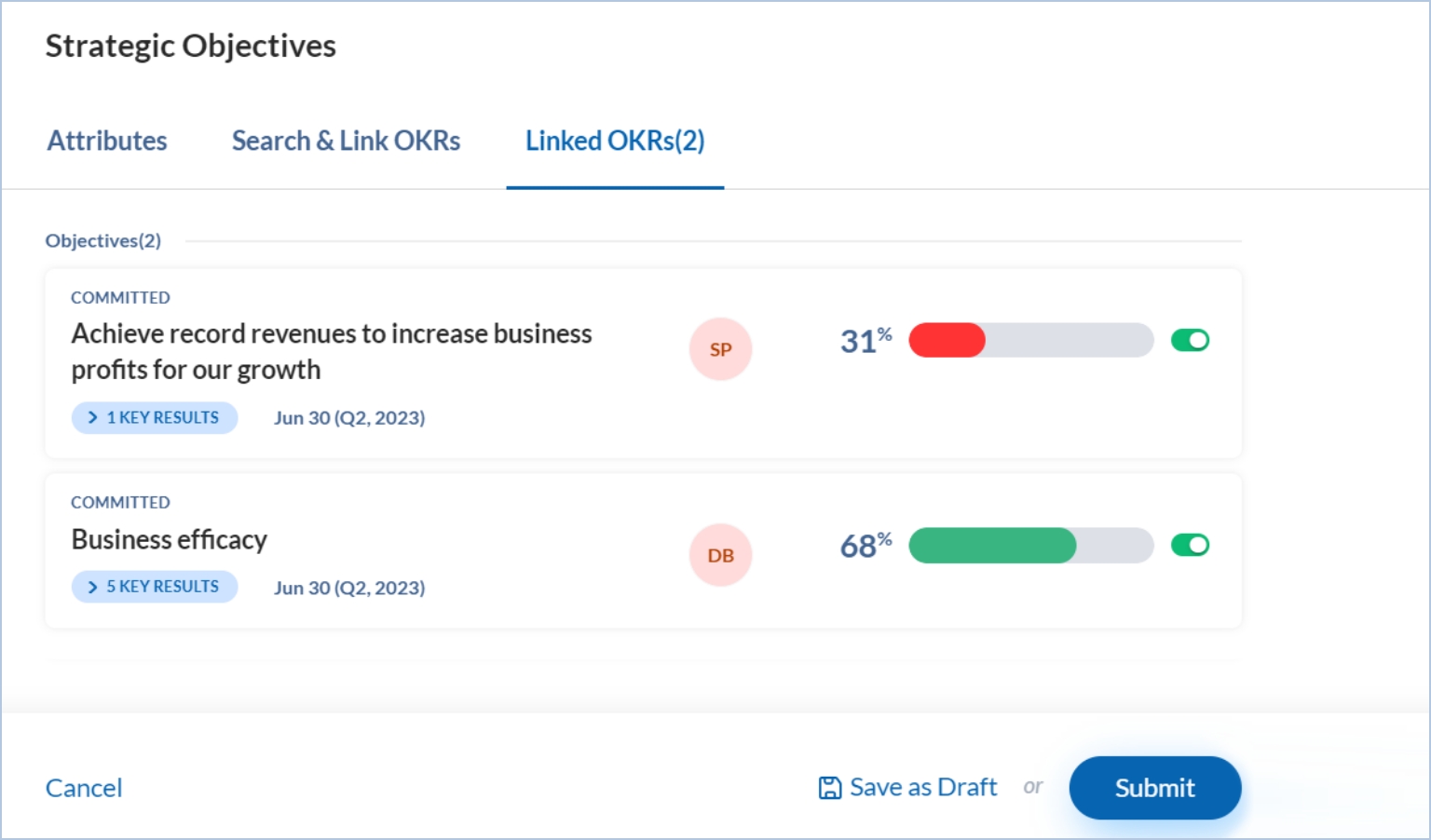 Note: If the Auto Roll-up is on, the progress of the linked objective or KR flows to the strategic objectives.