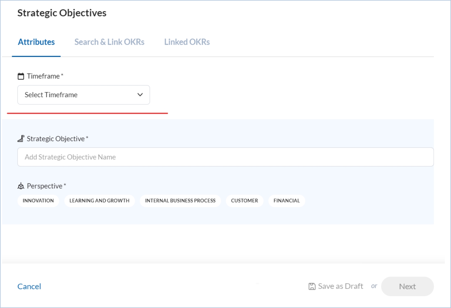 Step 1: Select a timeframe. The timeframe can be 1 year, 2 years, or 5 years. You can select anything as per your requirement. It is not bounded by the company’s OKR cycle.