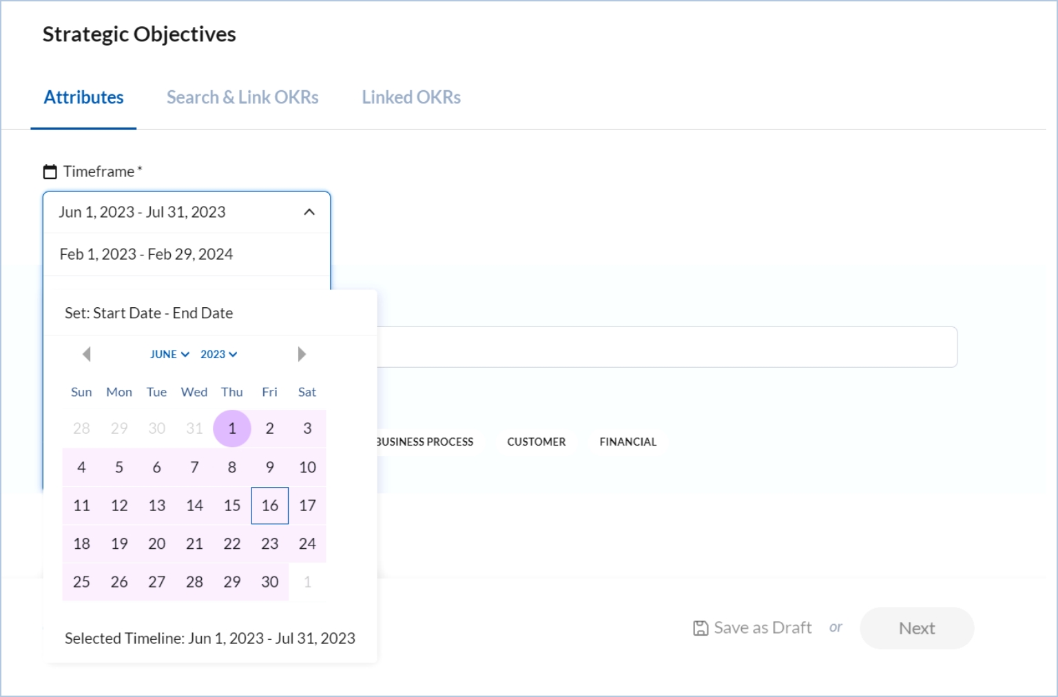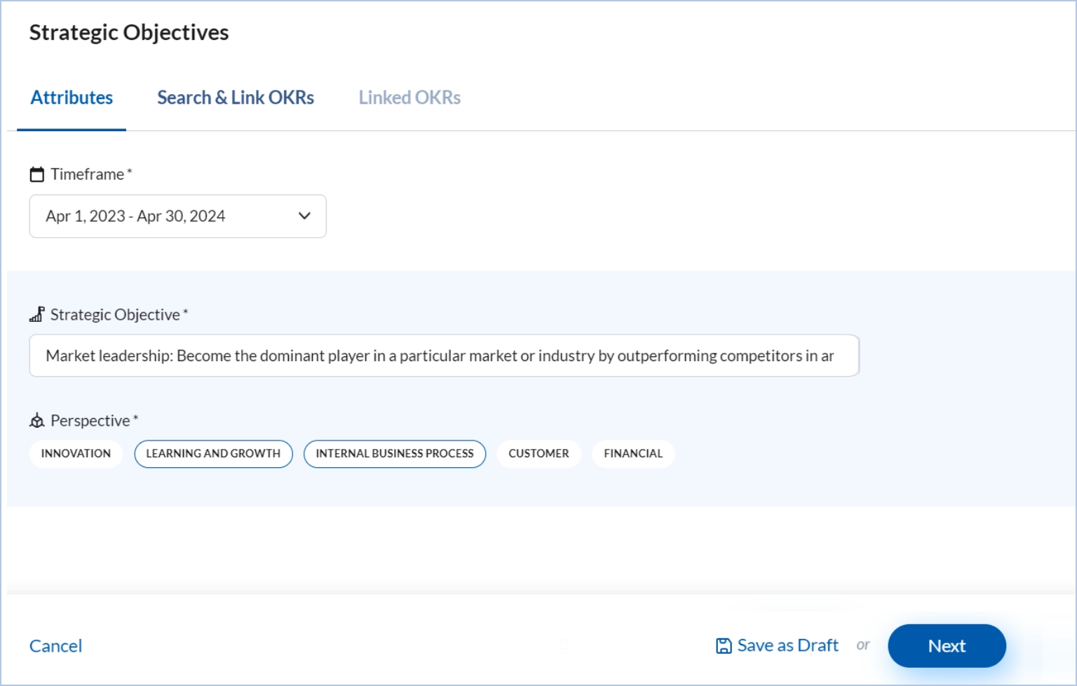 Once you have linked the strategic objective with objectives and key results, click Next to view all the linked objectives or KRs.