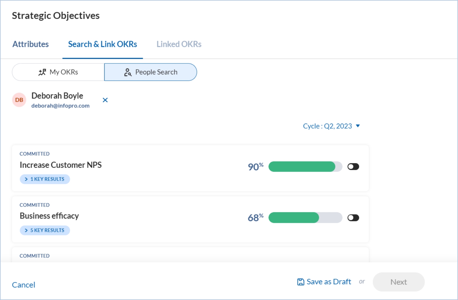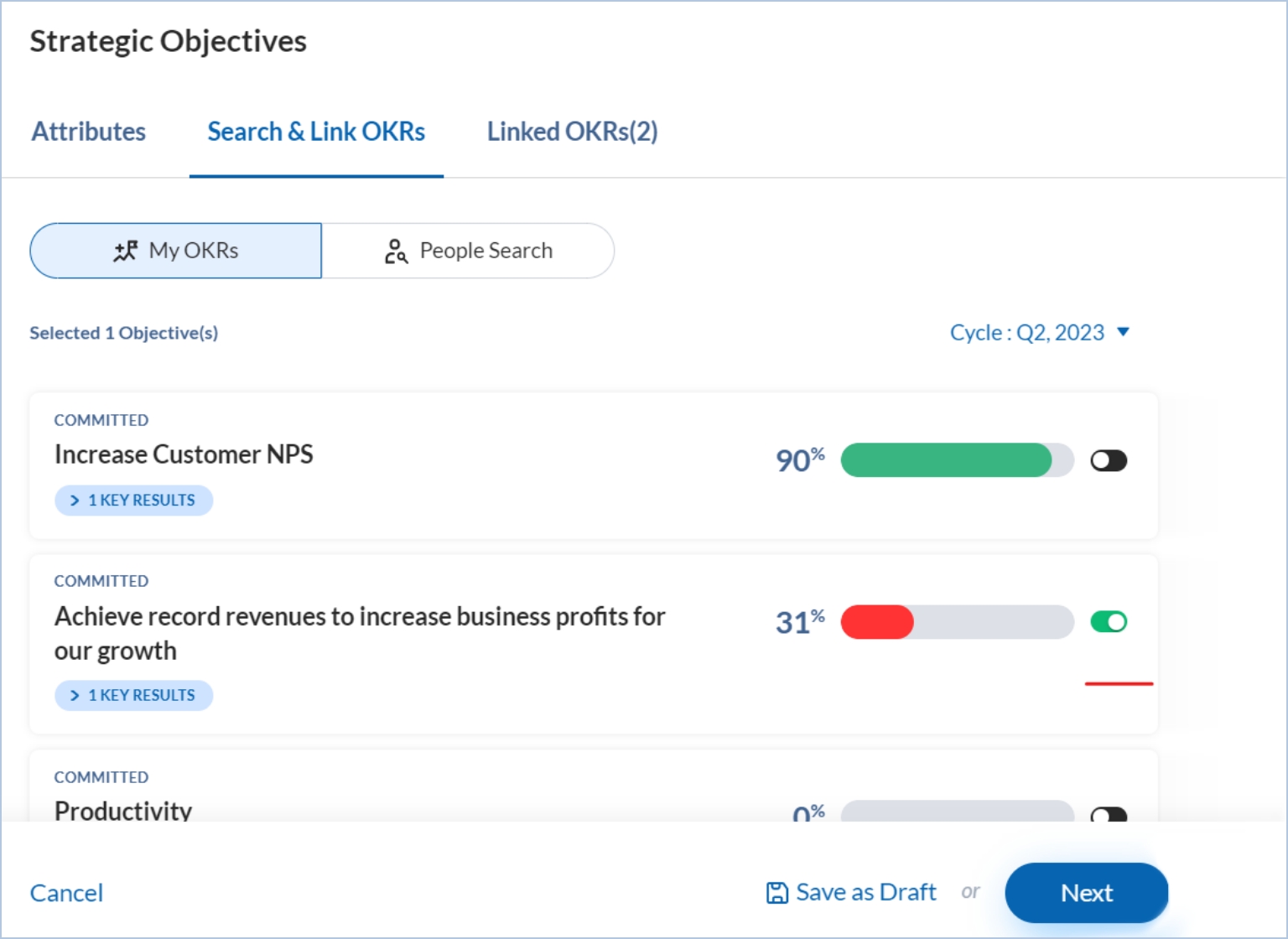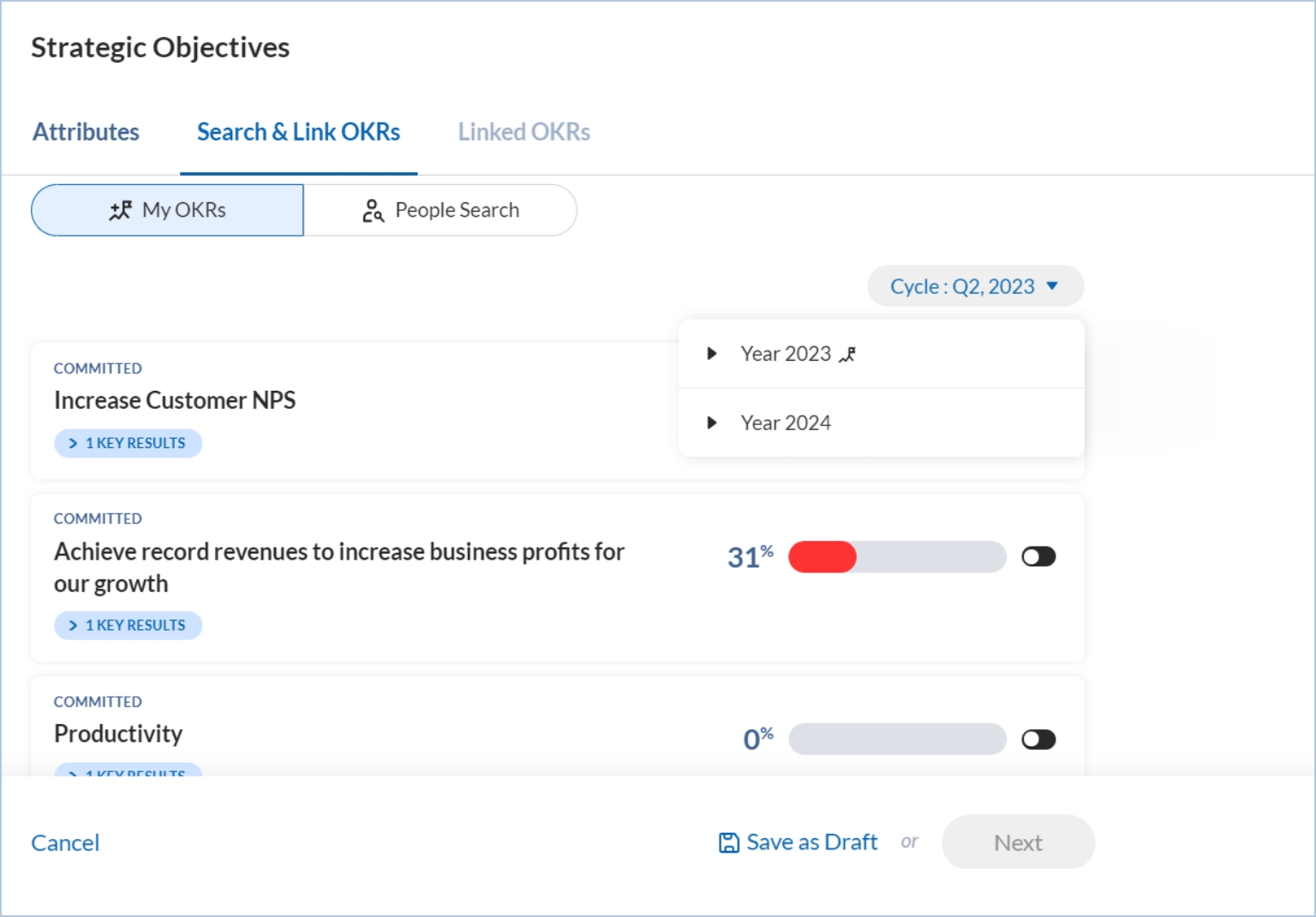 Step 2: Click Next to link the strategic objective with your or your colleagues’ objectives. You may also link the strategic objective with future cycle objectives. If you want to link the strategic objective with your objective, you will find all your current cycle objectives under My OKRs. You can change the OKR cycle to link an OKR with any future strategic objective.