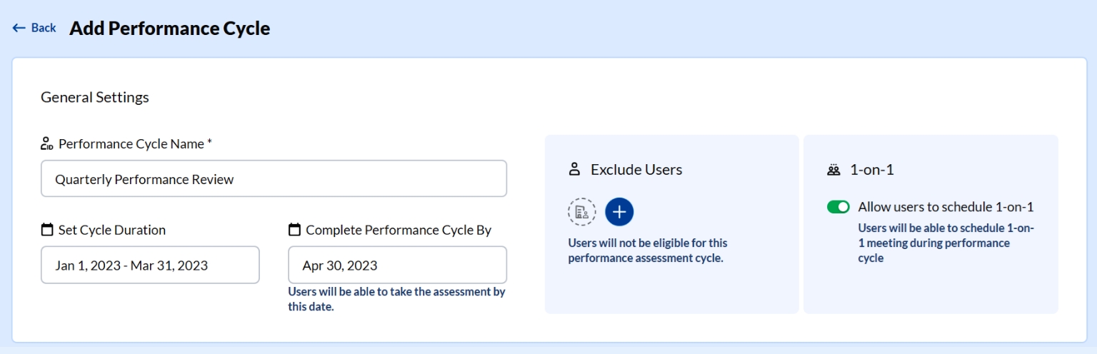 Step 4: In the next step, add a name for your performance cycle, say, Quarterly Performance Review. Set the duration of the performance cycle. Also, add a date of completion. This date could be different from the last date of the cycle. This implies performance review can be completed once the cycle ends.