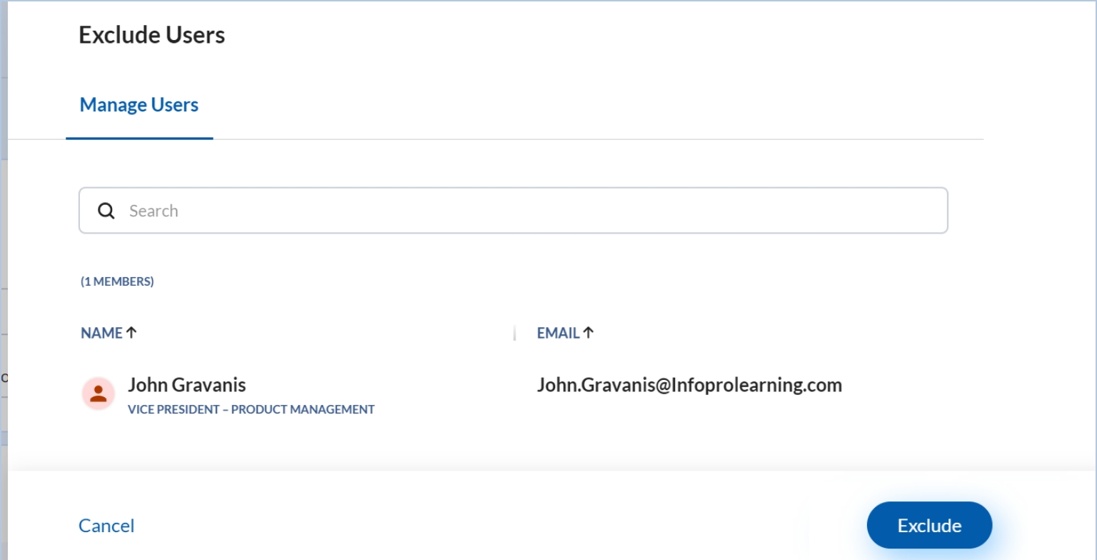 Step 5: To exclude a few users from the performance review cycle, click the “+” icon in the exclude users’ box. A right drawer opens. Search for the user(s) to be excluded and click on “Exclude”.