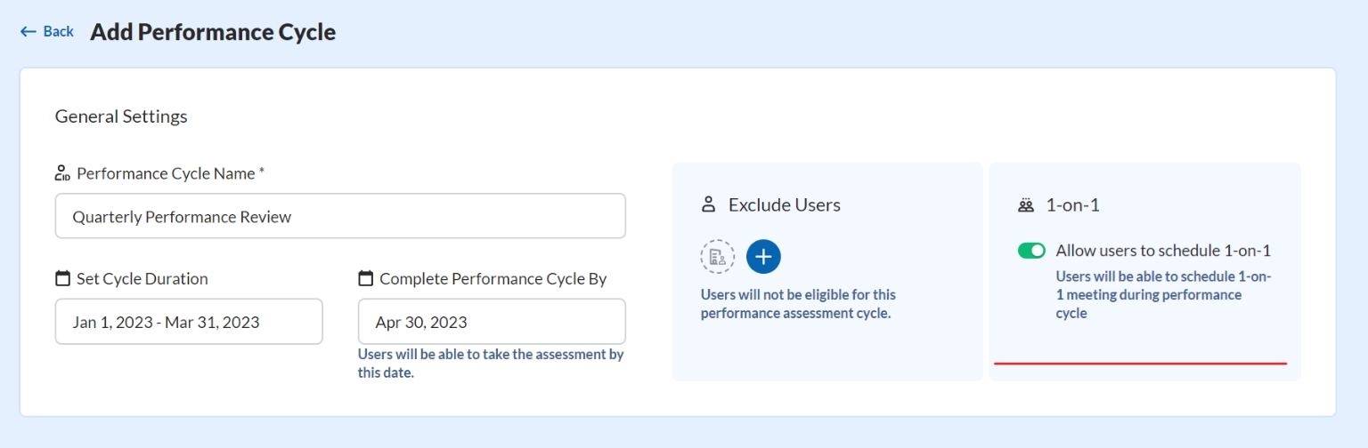 Step 6: To add 1-on-1 with your performance review, switch the toggle of “Request 1-on-1” to “Allow users to schedule 1-on-1” performance meeting for the performance review.