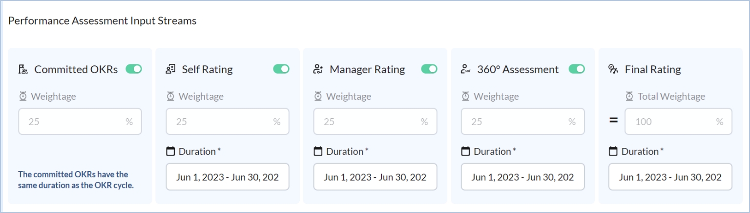 Above performance review inputs can be used according to your company’s policies and needs. You may turn input streams off or on. Manager rating, however, will be ON by default.