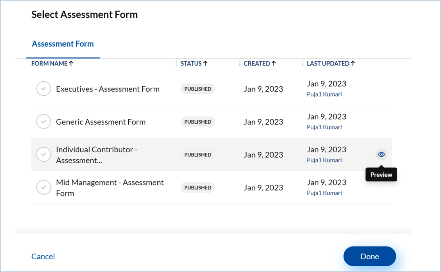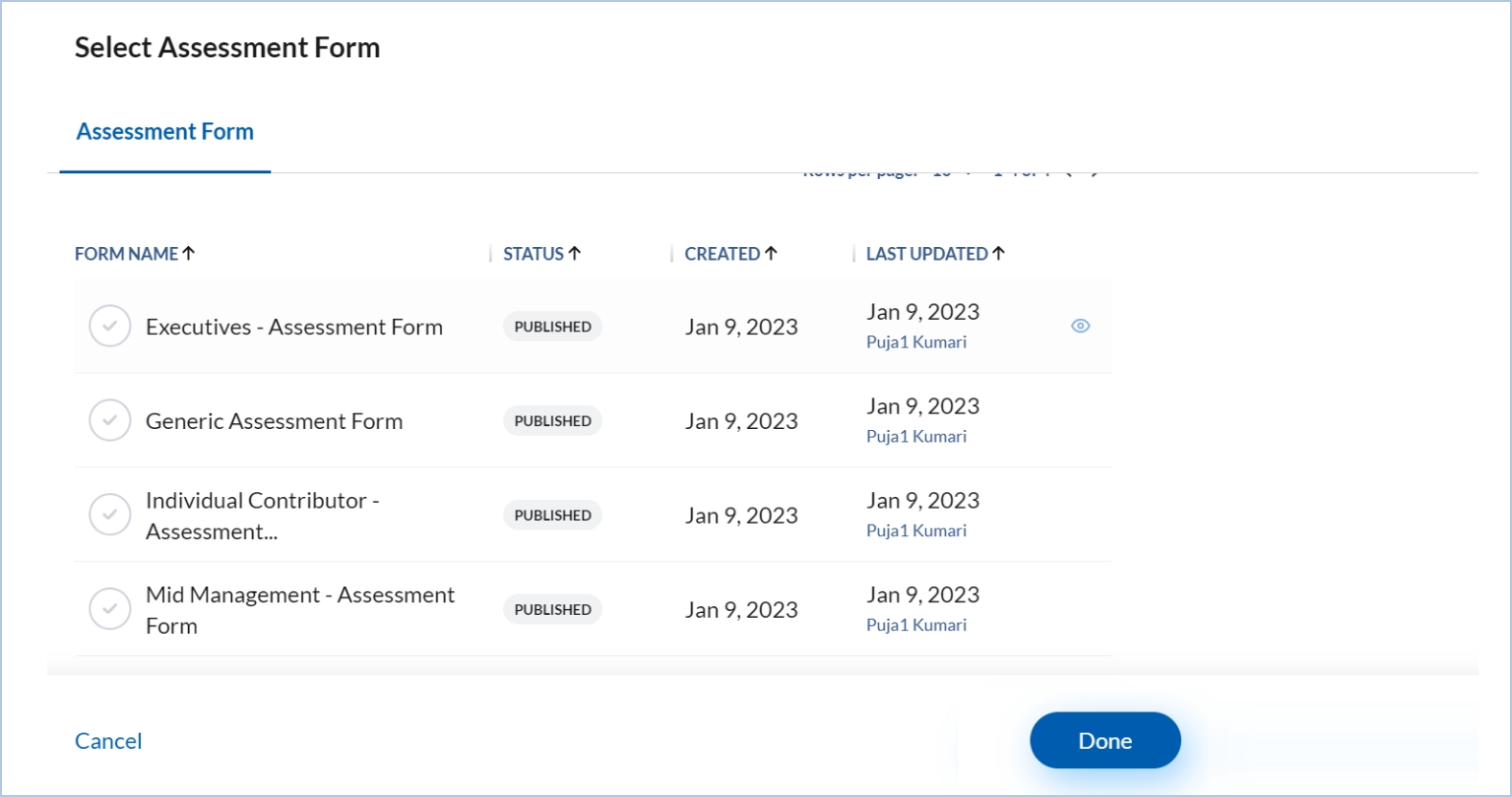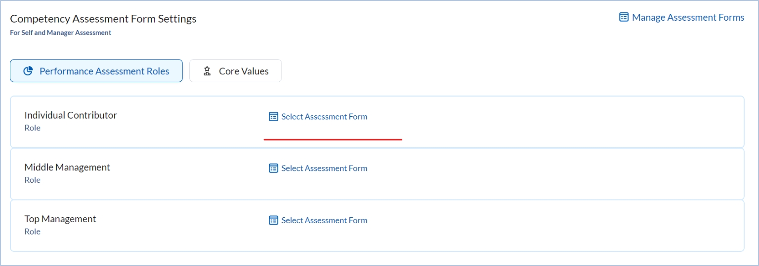 Select a rating form against each employee level in performance assessment roles by clicking “Select Assessment Form”.