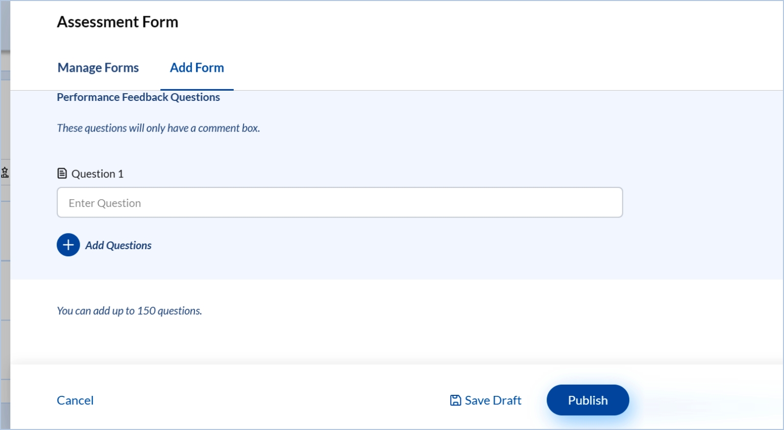 A blank template will appear where you can add the form name, rating and descriptive questions and save the form as a draft or publish the form. Once you publish it, it will be listed in the Assessment Form.