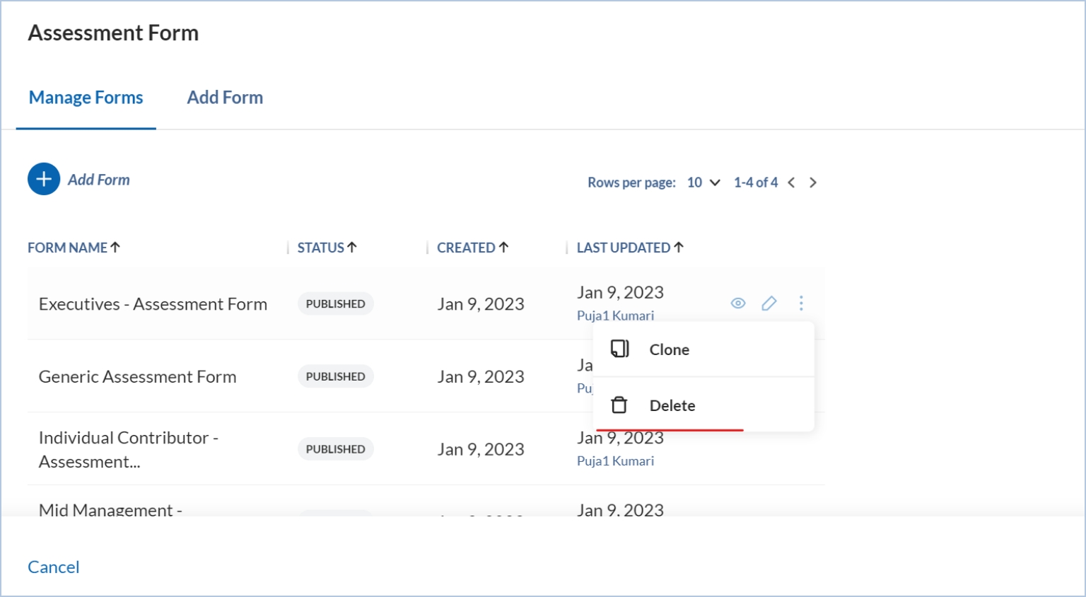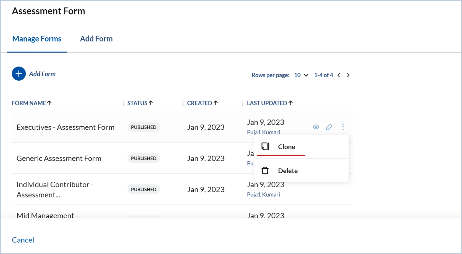 You may even clone a form by clicking on the clone icon inside the kebab menu.