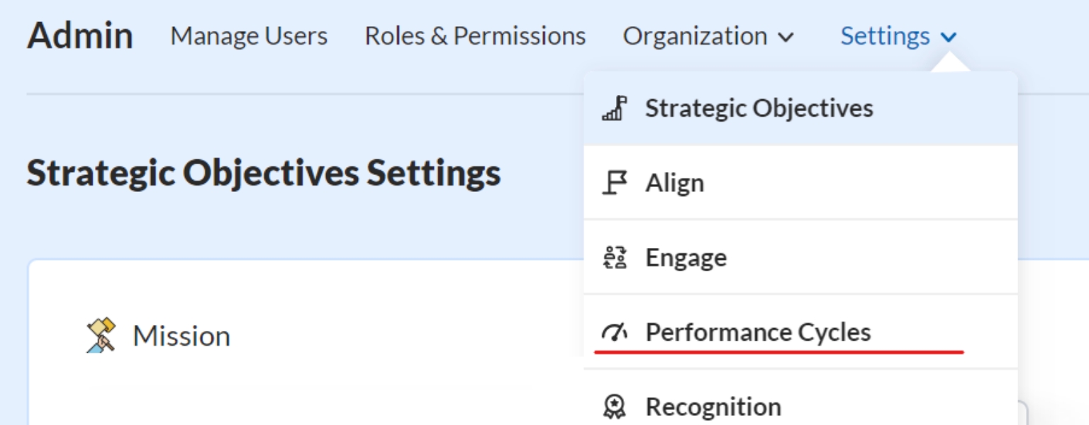 Step 2: Clicking on Settings opens a drop-down menu. Select Performance Cycles from there.