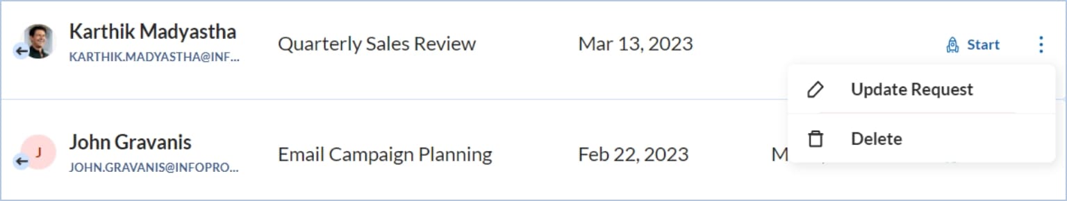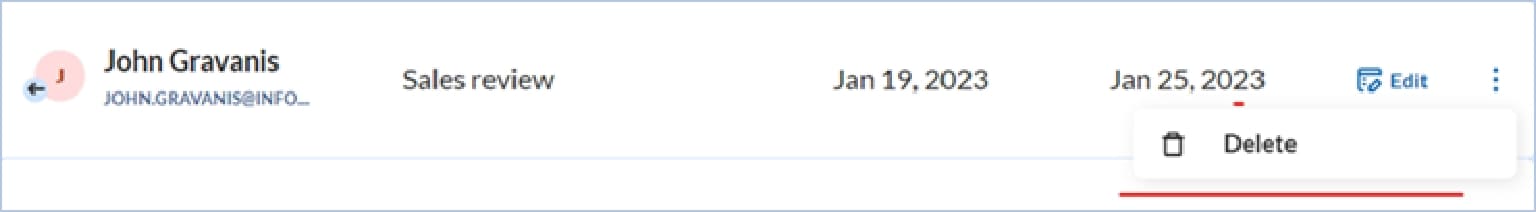 Step 1: Navigate to the meeting list, and identify the meeting invite to be deleted. Click on the kebab icon and select Delete.