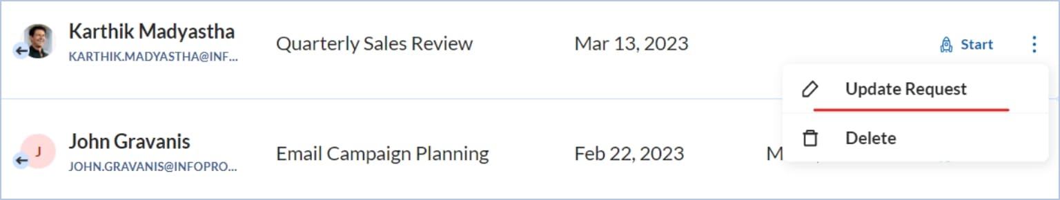 Step 1: You may navigate the meeting list and identify the meeting invite to be updated. Click on the kebab icon and select update request.