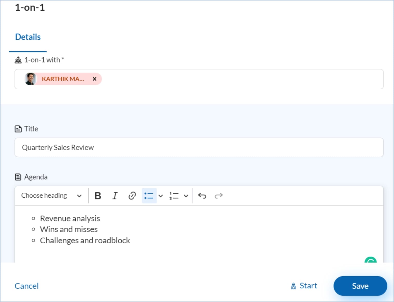 Step 2: The right drawer to send the meeting request will open; you can only edit the meeting title and agenda here. Edit the necessary changes and click on update to send the request.