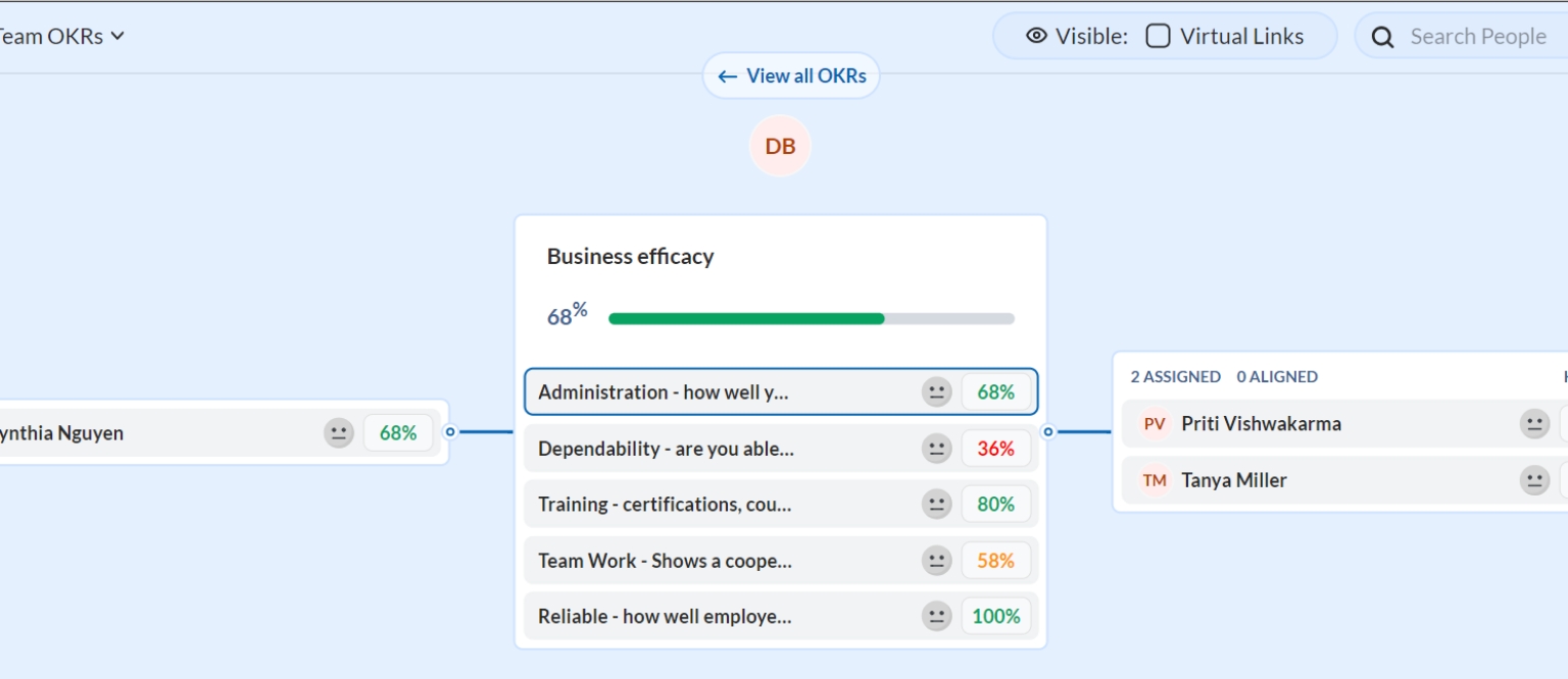Overall, an alignment map in OKR visually represents how objectives and key results cascade from the top level of the organization to the team and individual levels, thus fostering alignment, transparency, and collaboration.